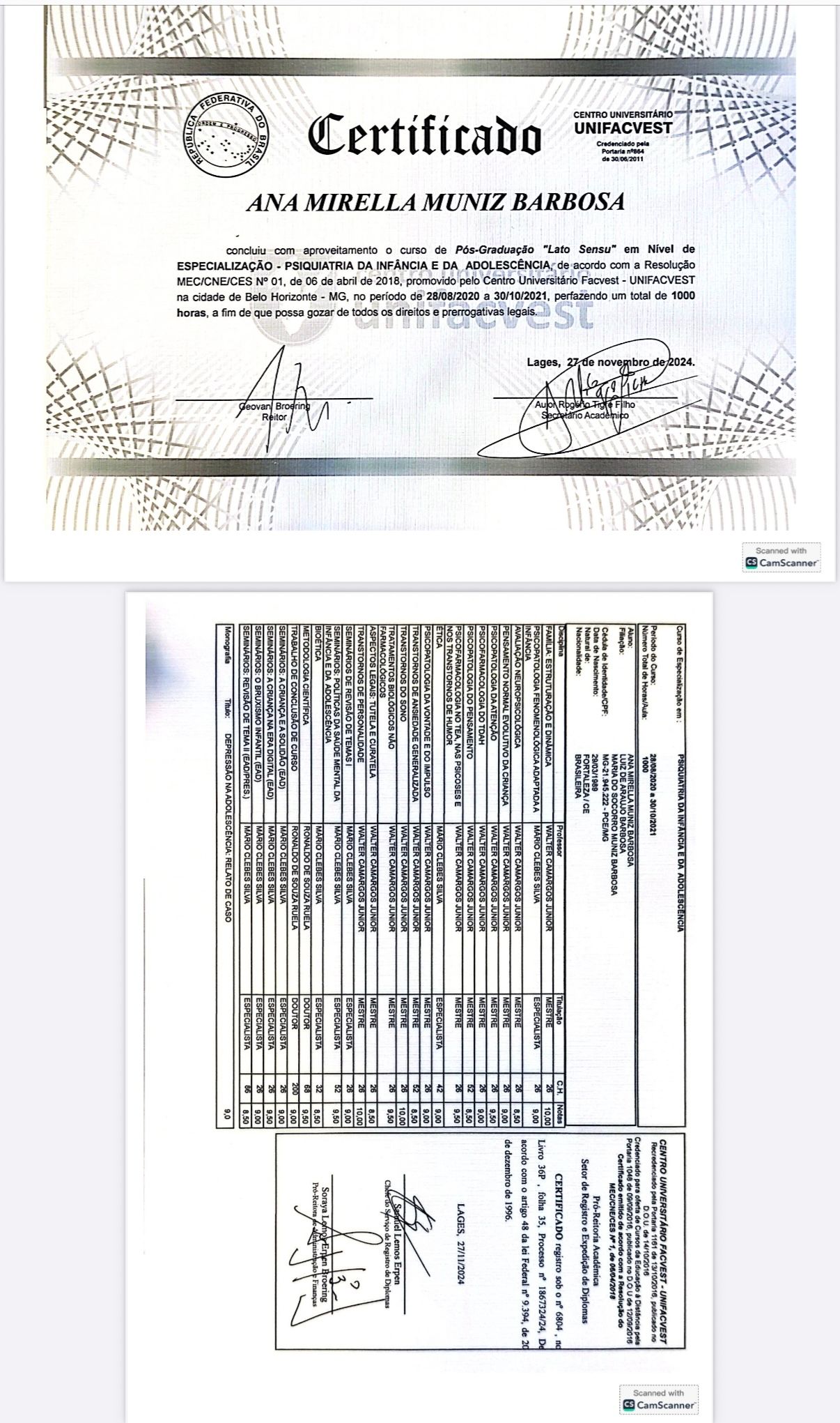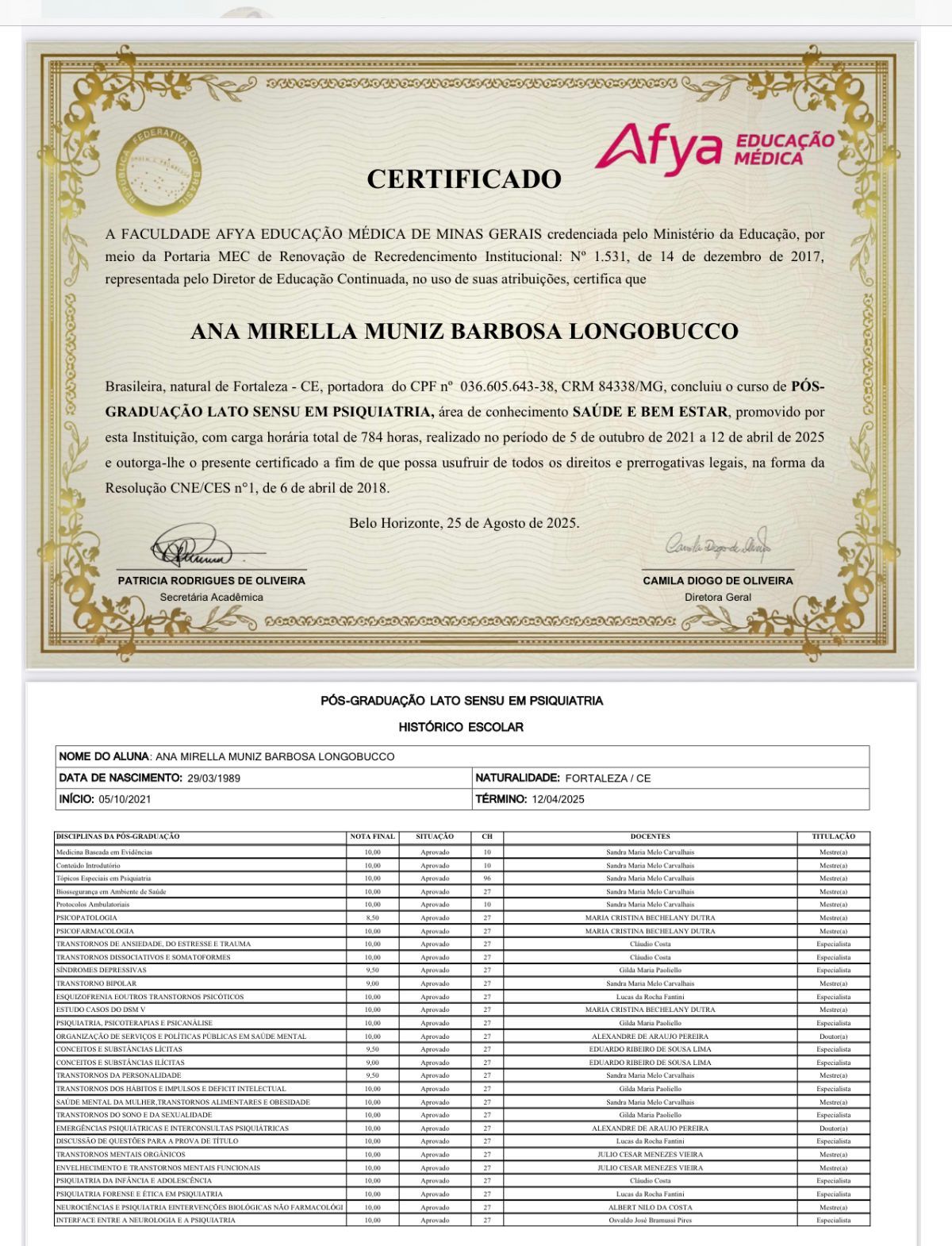 Possuo pós graduação em Psiquiatria do Adulto e pós graduação em Psiquiatria da Infancia e da Adolescência.